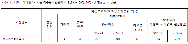 | 나군 | 스포츠운동과학과 | 14 | 4.9 | 9 | 49.00 | 100 | 61 | - | 78 | 72.00 | 3 |